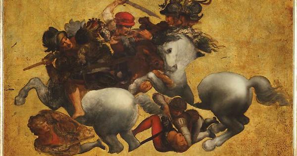 Strana la storia del pezzo. Disperso, ritrovato, documentato a casa Doria dal 1641 e poi venduto all’estero in deroga ad un vincolo che ne vietava l’alienazione. Prima toccò ad un mercante svizzero custodirla nel suo caveau, per venderlo poi ad un ricco giapponese. Ed ha i tratti di un vero e proprio giallo la storia avventurosa di questa piccola tavoletta dipinta ad olio le cui misure esigue (85x115 cm) l’apparentano più ad una icona bizantina che al magniloquente affresco che riproduce. L’affresco in questione è la celebre “sinopia” della Battaglia di Anghiari abbozzata da Leonardo da Vinci nel Sala del Maggior Consiglio di Palazzo Vecchio a Firenze. La stessa commissionata al pittore dal gonfaloniere Pier Soderini e lasciata incompiuta nel 1506, per la quale Leonardo pensò ad uno scontro furioso tra cavalli e cavalieri, mentre a pochi passi il suo vicino di “giornata”- che faceva Michelangelo di primo nome -, si cimentava con il cartone dell’avvincente Battaglia di Cascina.