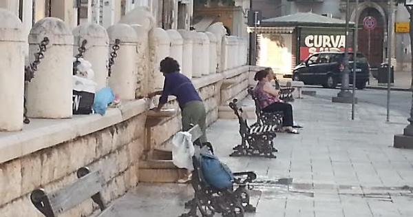 Lì, in piazza XX Settembre, a prendersi cura di sé, a rinfrescarsi, ripulirsi, dopo essersi cambiata d'abito tra i cassonetti della spazzatura. Qualche minuto e, con un garbo ed una maestria dal sapore antico, quasi in punta di piedi, sapone alla mano, fa il bucato. Ma no, non fa il risciacquo nelle fontanelle, sporcherebbe, smaltisce i residui di sapone aiutandosi con una mano, quasi svuotando la vasca bassa della fontanella, schizzando l'acqua sugli abiti. Anche quando li strizza lo fa con delicatezza. Le catene della piazzetta, su cui ogni bambino della nostra città ha dondolato almeno una volta nella sua vita, diventano d'improvviso un comodo stendibiancheria. L'aria è calda, fra un po' arriva anche il sole e, voilà, tutto è fatto. Il fresco guardaroba di un nuovo giorno è pronto, ripiegato con dolcezza e sistemato in uno zaino. Pulito, pulitissimo. È così gentile la signora. Augura buongiorno a chiunque incroci il suo sguardo. Lì, a qualche passo, c'è chi si gode le prime luci del giorno seduto su una panchina.