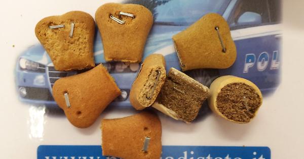 Gli agenti hanno effettuato una perquisizione presso l’abitazione di M.U. che ha esito positivo in quanto venivano rinvenuti: una scatola di biscotti per cani della stessa marca e tipo di quelli trovati nel parco, biscotti preparati con spille metalliche, confezioni di spille metalliche della stessa misura di quelle contenute nei biscotti e una confezione di petardi