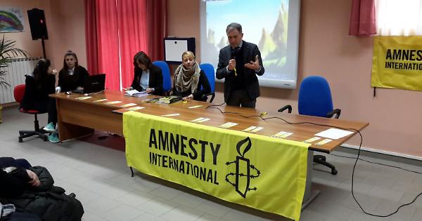 Dopo gli interventi del preside, di una docente e della responsabile di Amnesty in Basilicata, i ragazzi del triennio del Pasolini hanno organizzato un flash-mob