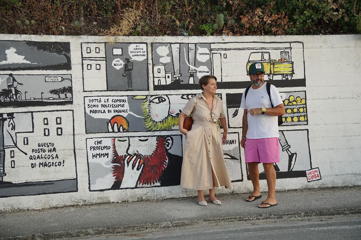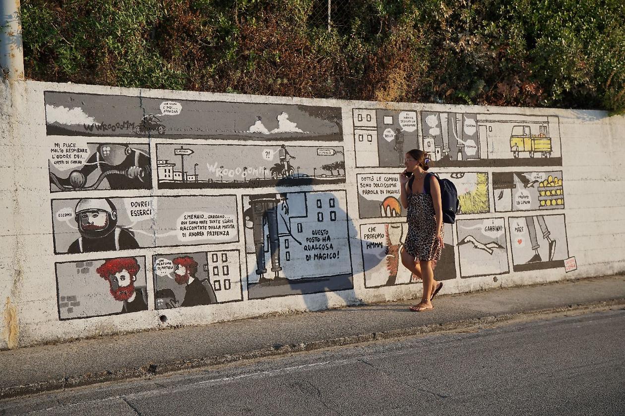 L'opera trasforma il paesaggio in racconto, le pareti in vignette e i passanti in lettori. È un viaggio immaginario, ma pieno di verità: profumi d’agrumi, sentieri tra pinete, l’azzurro del mare e l’emozione della scoperta.
