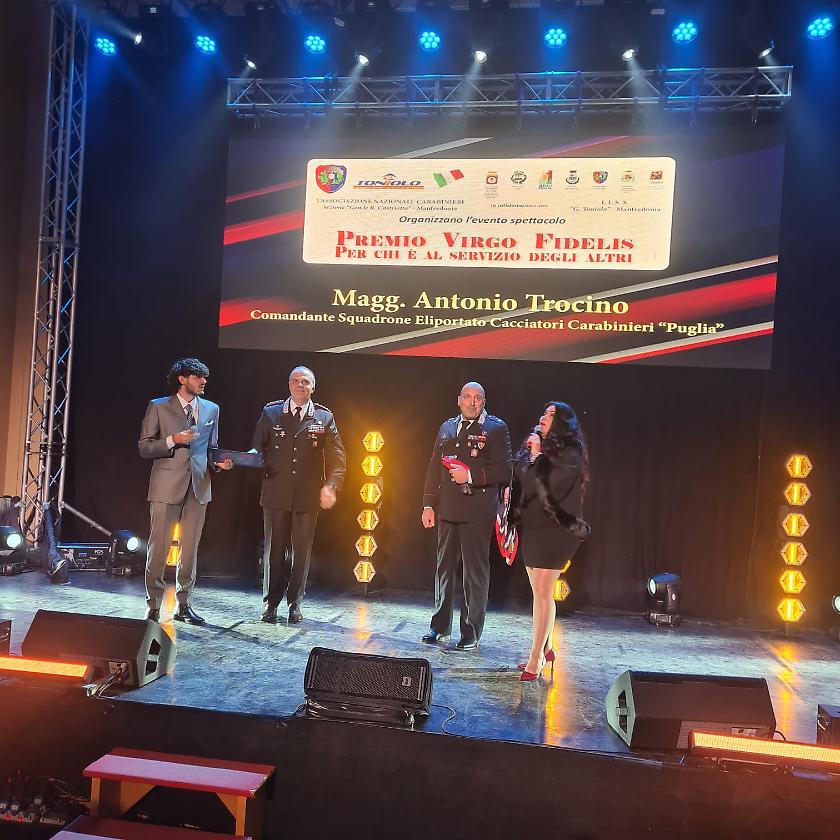 Quest'anno, il prestigioso riconoscimento ha valorizzato anche la dedizione e il coraggio del Maggiore Antonio Trocino, Comandante dello Squadrone Eliportato Cacciatori di Puglia.