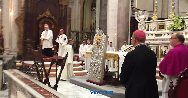 Partecipata celebrazione eucaristica officiata dall'arcivescovo di Foggia-Bovino, Vincenzo Pelvi (presente anche l'ex arcivescovo Francesco Tamburrino). Ad accompagnare il sacro Tavolo della Madonna in processione, insieme alla parlamentare del Pd Mongiello, il sindaco di Foggia, il presidente del Consiglio Miranda, gli assessori comunali Bove, Cangelli, Giuliani, Morese, Tucci, Roberto.