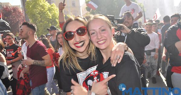 Labbra metà rosse e metà nere, tante piccole guanciotte arrossate di confusa emozione tra le braccia dei genitori, ragazze e ragazzi giovanissimi ebbri di entusiasmo: è la Foggia che veste il sentimento della festa ritrovandosi in piazza per la promozione in serie B
