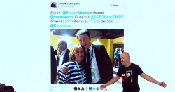Nel passare in rassegna i maggiori tweet curiosi della kermesse, il conduttore della popolare trasmissione Rai legge il tweet della parlamentare "Aspetti Obama e incroci Renzi..." e commenta dando voce a "ManfredoRoma", un nostro follower, che aveva ripreso il nostro retweet della Mongiello scrivendo: «... E mi spiace per lei: quanno se dice sfida!»