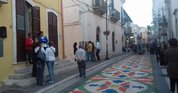Accolta da tappeti colorati di fiori e lamelle di tronchi essiccati dai colori brillanti e sapientemente accostati tra loro, gente del luogo e giunta da Foggia e dai paesi limitrofi passeggia allegramente in un vociare di bambini che si rincorrono festosamente.