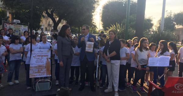 Alla manifestazione sono intervenuti la Dirigente dell’ I.C. “ Alfieri – Garibaldi” lFulvia Ruggiero, l’Assessore alla Pubblica Istruzione del Comune di Foggia Claudia Lioia, l’attuale Presidente del Rotary Club Foggia Domenico Gentile e il Past President del R.C. Foggia del 2014/15 Giulio Treggiari e il Maestro Leonardo Scarinzi. La Ruggiero ha ringraziato il Sindaco e l’amministrazione comunale per aver permesso lo svolgimento della manifestazione in un luogo “ strategico” della città. Il tema dell’emigrazione è molto caro alla città - ha continuato la Dirigente ricordando che l’assenza della statua è solo temporanea e alla sua mancanza si è deciso di sopperire, per l’occasione, con una valigia di cartone e un cappello su di essa per esprimerne tutto il suo valore simbolico. I bambini hanno riflettuto sul tema proprio partendo dal monumento, focalizzando l’attenzione sull’uomo di strada che ha bisogno di cercare una sua collocazione e che è partito dalla sua terra per giungere alla nostra sperando in un’accoglienza, che, in parte ha ricevuto dall’associazione I Fratelli della Stazione cui, infatti, la statua era stata affidata il giorno dell’Inaugurazione. Un bellissimo cartellone realizzato dai bambini ha rappresentato, con la collaborazione del Maestro Scarinzi, le fasi di realizzazione della statua e i suoi particolari. Poi il gruppo dei piccoli studenti della scuola primaria Garibaldi si è esibito suonando il flauto dolce e cantando alcune canzoni della tradizione sul tema dell’emigrazione. Non è mancato l’intervento di due alunni consiglieri del Consiglio comunale dei ragazzi che hanno salutato e invitato ad intervenire i due rappresentanti del Rotary Club Foggia. Domenico Gentile, nel salutare e ringraziare per la bellissima iniziativa e nel congratularsi con i ragazzi e gli insegnanti e la Dirigente, ha ricordato come l’arte possa essere utilizzata per sensibilizzare a grandi temi e trasmettere dei messaggi e come, quindi, la Street statue donata dal club alla città abbia avuto questa funzione oltre che essere un arricchimento dell’arredo urbano in un luogo molto importante e nevralgico per la città di Foggia che rappresenta molto di più di una semplice stazione ferroviaria per i tristi avvenimenti accaduti durante il secondo conflitto mondiale. Si è rivolto poi ai bambini che hanno suonato e cantato in questo luogo identificandoli come il simbolo della rinascita della città. E’ poi intervenuto Giulio Treggiari che, Presidente nel 2014/15, ha voluto fortemente il dono e l’istallazione del monumento “ Ritorno a casa” e che esordisce richiamando la “ rotazione da un presidente all’altro in una carica che si rinnova annualmente proprio a sancire il principio di uguaglianza tra pari in un’associazione il cui motto è “ serve above self” (servire al di sopra di ogni interesse personale). Treggiari ha poi ricordato vari atti vandalici di cui la statua è stata oggetto e di come, fedeli al principio della teoria della “ finestra rotta” il club, insieme all’amministrazione comunale di cui ora la statua è in proprietà, l’abbia sempre fatta restaurare per educare a principi di civiltà e legalità. Non è un caso forse che questo “viaggiatore” sia stato sempre bersaglio di foggiani (come dall’individuazione da parte delle telecamere di sorveglianza) e non, come molti sarebbero indotti a ritenere, degli immigrati che popolano le strade del quartiere Ferrovia. “Mamma mia dammi cento lire”, “ Paese mio che stai sulla collina – Che sarà” – “ La donna del Sud, “Trenta giorni di nave a vapore” e tanti altri canti della tradizione popolare, magnificamente eseguiti dal piccolo coro degli allievi della Garibaldi diretti dal Maestro Angelo, hanno preceduto l’intervento del Maestro Leonardo Scarinzi che ha progettato e realizzato il monumento e si sta occupando del restauro. Lo scultore ci tiene a precisare che non è possibile assecondare i più svariati suggerimenti come quello di montare la statua su un piedistallo o di circondarla con un recinto perché se ne snaturerebbe la sua essenza di “ statua di strada”, nata cioè per integrarsi con l’ambiente antropico circostante creando con esso un tutt’uno. Ricorda quanti si sono fermati a farsi un selfie con il “ viaggiatore” o addirittura ci hanno “ chiacchierato” di notte addolcendo così la solitudine. E’ proprio il movimento intorno alla scultura a renderla viva – ci dice e apprezza molto l’immagine costruita con la valigia di cartone e il cappello come scenografia della performance di oggi. La valigia acquista quindi la valenza simbolica di un viaggio che rappresenta anche il percorso che ognuno compie all’interno e al di fuori di sé durante la vita. L’ultimo intervento è stato di Claudia Lioia, assessore alla P.I. del Comune di Foggia che ha sostenuto la manifestazione. Molto colpita dalla bravura dei bambini, dei docenti e particolarmente grata alla Dirigente Scolastica per aver portato in questa piazza il bellissimo lavoro realizzato dalla scuola. L’assessorato ha prestato quest’anno particolare attenzione ai temi sociali e quella dell’immigrazione è stata una problematica particolarmente approfondita. E’ stato, infatti, anche l’oggetto dell’ultimo progetto dell’assessorato “ Uno spot per la città” che ruotava intorno all’integrazione nel suo senso più ampio e perciò intesa come rispetto dell’altro e quindi del diverso per cultura, lingua o religione. La bellissima festa per questi bambini, che hanno fatto onore al lavoro dei loro insegnanti affrontando con molto impegno sia la riflessione culturale sul tema sia l’impegno artistico, è terminata con i canti “ Il treno che viene dal Sud” e “ La valigia di cartone” e con l’annuncio che non solo il nostro “ viaggiatore” tornerà presto a casa ma che molto probabilmente non sarà più solo! Una sorpresa ci attende!