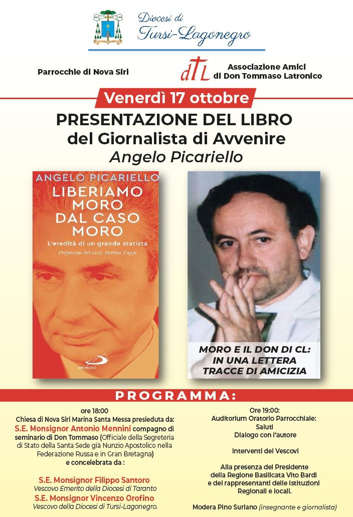 A seguire, alle ore 19:00, presso l’Auditorium dell’Oratorio Parrocchiale, si terrà l’incontro pubblico con l’autore, moderato dal giornalista e insegnante Pino Suriano. Nel suo volume, Picariello propone una lettura nuova e profonda della figura di Aldo Moro, tra i fondatori della Democrazia Cristiana e padre costituente, 5 volte presidente del Consiglio dei ministri, profondo conoscitore della questione mediorientale, declinando le proprie posizioni nel complesso scacchiere geopolitico dell'epoca secondo l’autodeterminazione dei popoli e la tutela della persona umana e protagonista assoluto della politica estera del nostro Paese a cavallo tra gli anni '60 e '70 , restituendolo alla sua dimensione più vera: quella dell’uomo di fede, del politico animato da un autentico spirito cristiano. Tra le pagine del libro emerge anche l’intenso legame spirituale tra Moro e Don Tommaso Latronico, testimoniato da una lettera in cui si riflette una sincera amicizia e la condivisione di pari ideali. Nel novembre del 1974, infatti, una lettera di don Tommaso Latronico venne inviata ad Aldo Moro, a breve nuovo presidente del Consiglio. Il sacerdote lucano invitava Moro alla “Scuola di Comunità” organizzata da Comunione e Liberazione presso l’Auditorium dell’Agostinianum a Roma.