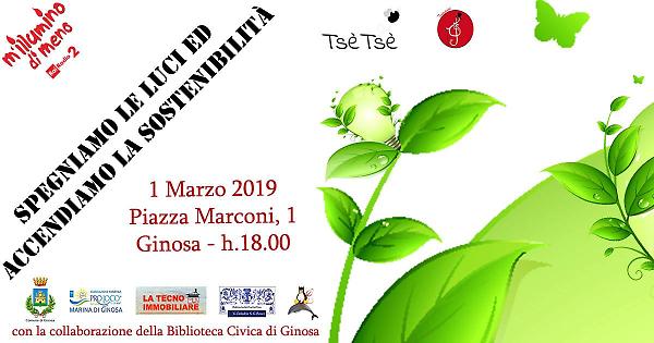 E in questa stessa data l’Associazione TsèTsè, nata nel 2016 a Marina di Ginosa (località balneare limitrofa alla lucania) con l'intento di promuovere e divulgare a ventaglio le chicche e le brillantezze da rispolverare del Territorio, attraverso la Sostenibilità, favorendo e impegnandosi nell' Educazione ambientale, realizzerà fisicamente un evento per appoggiare e sostenere M'illumino di Meno, attribuendo anche un titolo targato TsèTsè ovvero: “Spegniamo le luci ed accendiamo la sostenibilità_ #M'illumino di meno che si svolgerà il 1 Marzo in Piazza Marconi a Ginosa, in contemporanea con la diretta di RaiRadio2_Caterpillar dalle ore 18 alle 20, patrocinato dal Comune di Ginosa.