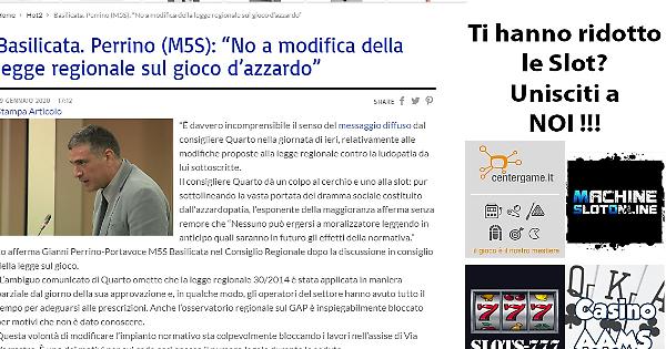 Il sito pressgiochi.it è un portale dedicato a tutti gli appassionati del settore. Mercoledì 29 gennaio ha pubblicato un articolo dedicato all'opposizione di Gianni Perrino (M5s Basilicata) alla modifica della legge regionale 30/2014, quella sul gioco d'azzardo. Alla destra del pezzo, la beffa: vengono inserite delle pubblicità che sponsorizzano giochi d'azzardo online. Lo spot principale è «Ti hanno ridotto le slot? Unisciti a noi!!!».