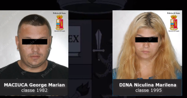 l'arresto di due conviventi rumeni George Marian Maciuca 31 anni e Niculina Marilena Dina 18 anni e con l'accusa di sfruttamento della prostituzione e violenza e resistenza a pubblico ufficiale con l'aggravante dell'autolesionismo.
