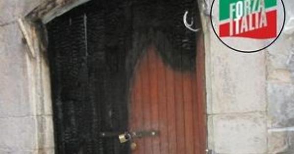 La porta d'ingresso danneggiata della sede di Forza Italia a S. Marco