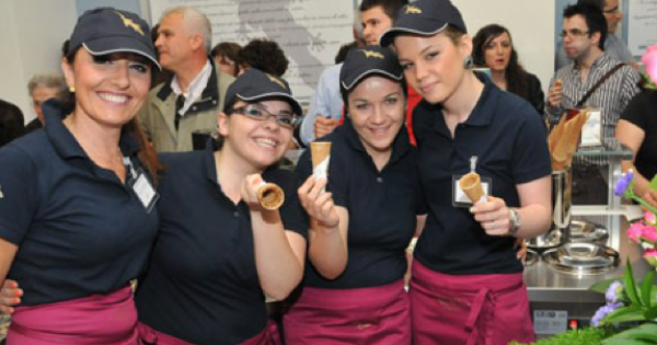 Alcune dipendenti della famosa gelateria all'inaugurazione della sede di Piazza Giordano