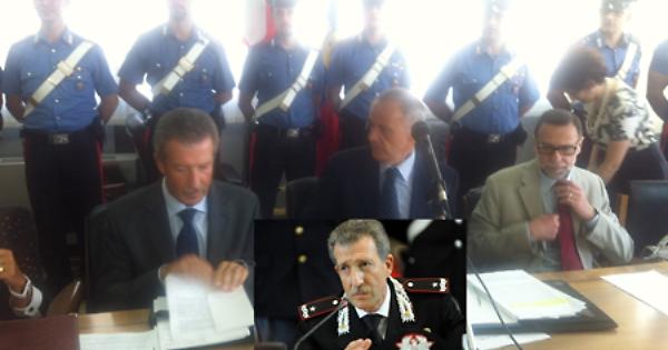 La conferenza stampa in corso, nel riquadro il generale dei Cc Mario Parente