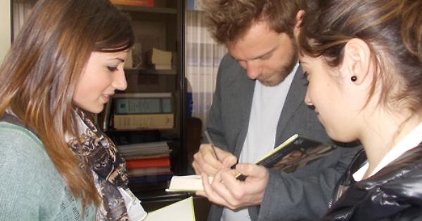 Paolo Giordano autografa il suo libro ad due studentesse del "Lanza"