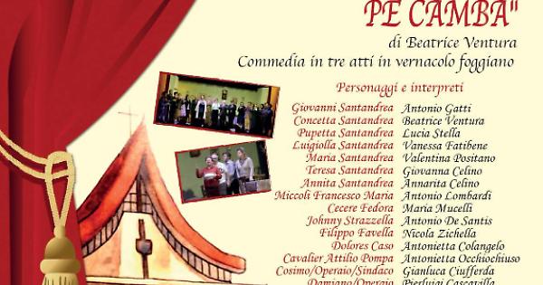 "Tutte se pote fà... pe cambà" è il titolo della nuova esilarante commedia in vernacolo foggiano della Compagnia teatrale "Rino la Viola" che andrà in scena al Teatro SS. Guglielmo e Pellegrino sabato 27 e domenica 28 febbraio (ingresso ore 20, sipario 20.30). Lo spettacolo in tre atti è scritto da Beatrice Ventura, che firma anche la regia. Diciotto i personaggi, altrettanti gli interpreti. Protagonista della commedia una famiglia piena di donne, in cerca di fortuna. Il padre ha perso il lavoro, e la mamma se ne inventa una con la speranza di sistemare anche le figlie o la cognata zitella: aprire un'agenzia matrimoniale. E lo scapolo facoltoso puntualmente arriverà...