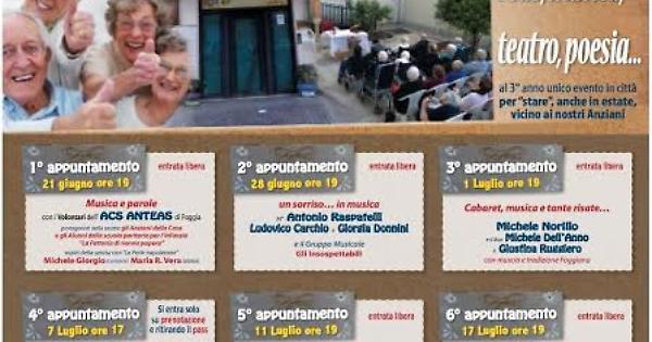 Una serie di serate-evento che si protrarranno sino al 17 luglio. Tutti gli spettacoli sono in programma con inizio alle ore 19.00, giardino interno della Casa per Anziani in Piazza San Pasquale. Il primo appuntamento è previsto in data 21 giugno con gli amici Volontari dell'ACS ANTEASdi Foggia. Protagonisti della serata gli Anziani della Casa e gli Alunni della Scuola paritaria per l’Infanzia “La Fattoria di nonna papera”. Ospiti: Michele Giorgio (cantante) e Maria Rosaria Vera(attrice)