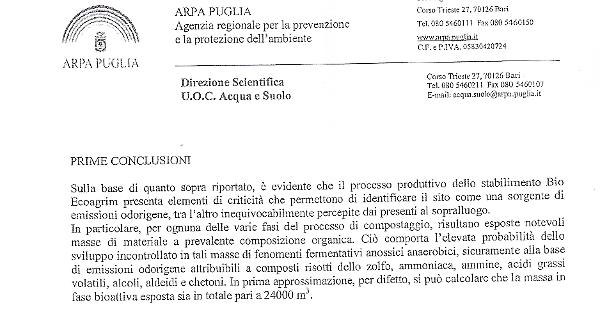 l'Arpa, che ha inviato la relazione il 14 agosto a tutte le autorità del territorio, comunque «si riserva successiva valutazioni sulla correlazione fra le molestie olfattive segnalate dai cittadini di Lucera e Foggia e quanto riscontrato nella presente relazione al termine della campagna complessiva di indagini ambientali avviate dall'Agenzia su una serie di siti potenzialmente identificabili quali fonti emissive».