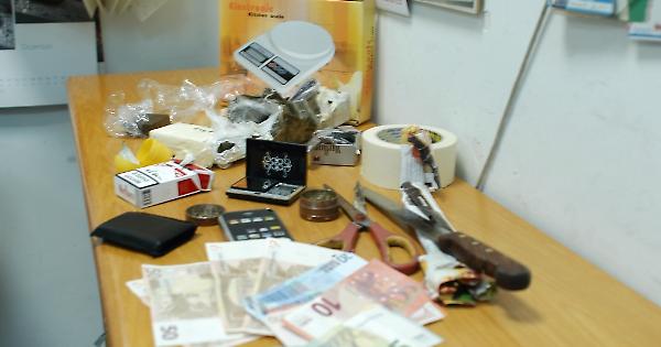 Durante la perquisizione sono state sequestrate 2 panette di hashish, un involucro avvolto da nastro adesivo marrone con all’interno una panetta di hashish, un altro con all’interno una panetta di hashish, un pacchetto di sigarette con 6 stecchette di hashish e vari contenitori con cocaina.
