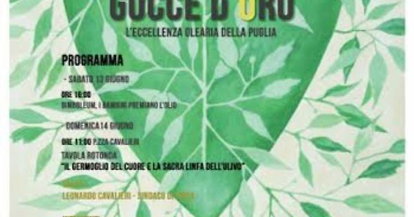 Incontro a latere della premiazione delle eccellenze meglio classificatesi nella quarta edizione del concorso Gocce d'Oro, destinato anche quest'anno a promuovere i migliori oli d'oliva del territorio. Alla premiazione delle 12:00, farà seguito un "apertiolio" in piazza Giovanni XXIII, un particolare aperitivo gratuito a base di prodotti tipici della gastronomia locale e degustazioni a tema, assolutamente immancabili, di oli d'oliva