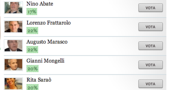 Testa a testa, per il momento tra Lorenzo Frattarolo e Augusto Marasco con il 22% dei voti; al secondo posto, a parità con il 20% Gianni Mongelli e Rita Sarò; infine, con il 17%, Nino Abate.Manca ancora il tuo pronostico? Cosa aspetti a votare e a far votare?Clicca qui