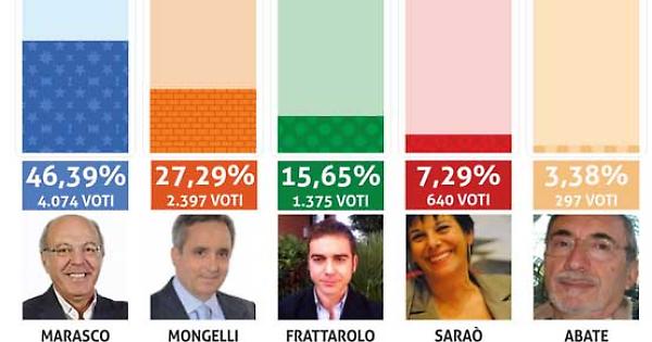 Augusto Marasco si aggiudica le primarie del centrosinistra a Foggia. Sarà lui a rappresentare la coalizione alla competizione per le comunali del 25 e 26 maggio prossimi. L'architetto foggiano ottiene 4.074 preferenze, il 46,39% degli 8.782 voti validi. Il sindaco Gianni Mongelli prende 2.397 preferenze, il 27,29%; Lorenzo Frattarolo, nonostante la benedizione del sottosegretario Ivan Scalfarotto, si ferma al terzo posto con 1.374 voti, il 15,65%; Rita Saraò ottiene 640 voti, il 7,29%. Infine, Nino Abate prende 297, il 3.38%.