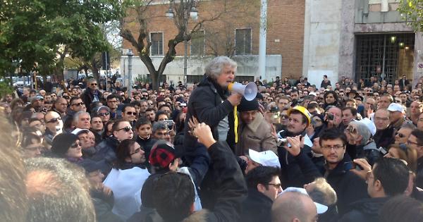 È arrivato a Foggia in carrozza intorno alle 10 di questa mattina, Beppe Grllo. Il comico genovese, fondatore del Movimento 5 Stelle, ha esordito, come immaginabile, con una battuta sull'emergenza rifiuti in città. Ma ne ha avute per tutti, anche per il presidente della Regione Vendola, accusato di fare politica non chiaramente. Cambiamento radicale, politica partecipata, informazione, sono alcuni dei maggiori temi trattati nel comizio che potete seguire sul nostro canale Youtube: cercate "Il Mattino di Foggia"