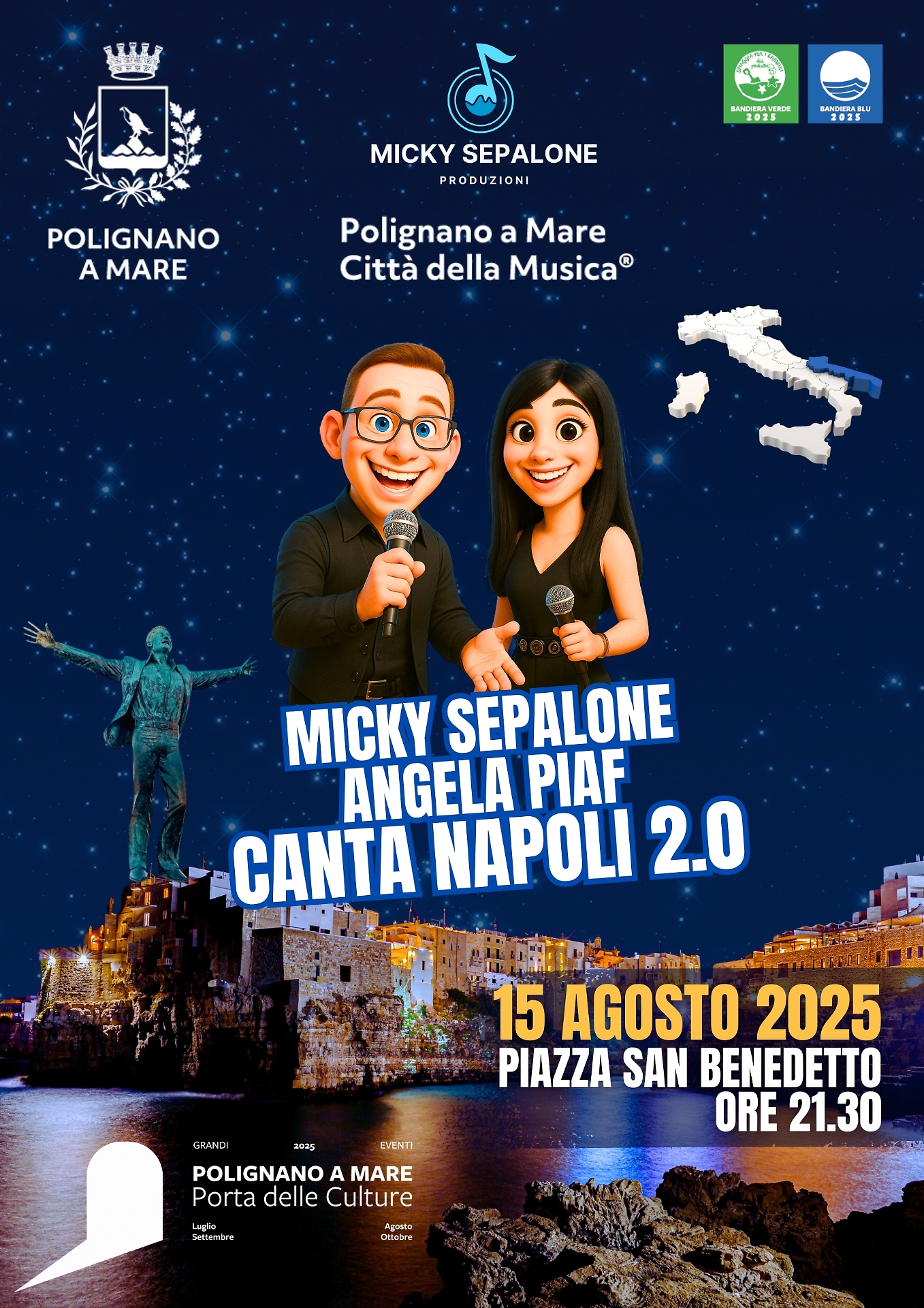 L'Amministrazione Comunale di Polignano a Mare, nell'ambito del ricco programma di "Polignano Eventi 2025 - Porta delle Culture", lo annuncia come uno degli appuntamenti più attesi dell'estate: il concerto di Ferragosto con Micky Sepalone, Angela Piaf e la Canta Napoli Band. Dopo lo straordinario successo dello scorso anno, l'evento si terrà nuovamente nella suggestiva cornice del Centro Storico, in Piazza San Benedetto, a dimostrazione della volontà dell'Amministrazione di valorizzare i luoghi più iconici della città e di offrire a residenti e turisti un'esperienza indimenticabile, immersa nella storia e nella bellezza di Polignano. L'artista Micky Sepalone, la talentuosa Angela Piaf e la travolgente Canta Napoli Band presenteranno uno spettacolo sempre innovativo, con una scaletta ricca di sorprese e arrangiamenti unici, capaci di far rivivere l'energia della tradizione musicale partenopea e non solo. Un viaggio sonoro che, come già accade, farà cantare, ballare ed emozionare il pubblico presente, residenti, turisti e visitatori provenienti da ogni parte del mondo. L'appuntamento è per il 15 agosto 2025 alle 21.30 in Piazza San Benedetto, nel cuore pulsante di Polignano a Mare. Un'occasione imperdibile per celebrare il Ferragosto all'insegna della musica, della cultura e dell'allegria.