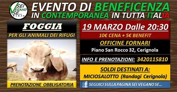 Una serie di iniziative di beneficenza si svolgeranno in contemporanea in varie città d'Italia dal 16 al 19 marzo. L'ondata di solidarietà a favore dei rifugi che ospitano animali abbandonati al fine di raccogliere fondi per sfamarli e curarli è stata lanciata da Sei Vegano se..., organizzazione che promuove attività in sostegno delle strutture che danno riparo ad animali salvati dallo sfruttamento dell’uomo e che fa riferimento all'omonima pagina Facebook. Proprio tramite il social è partita l'iniziativa che coinvolgerà 36 provincie e che consisterà in eventi di vario genere, da interviste radiofoniche a cene benefit, a manifestazioni di piazza, sia per rimpinguare le casse di associazioni e volontari che quotidianamente si prodigano per aiutare i nostri fratelli di zampa e pelo in difficoltà, sia per sensibilizzare l'opinione pubblica sulla tematica della salvaguardia della vita animale.