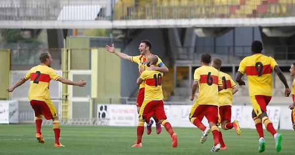 L'esultanza del Benevento dopo il gol di Lucioni (Ph. Ottopagine)
