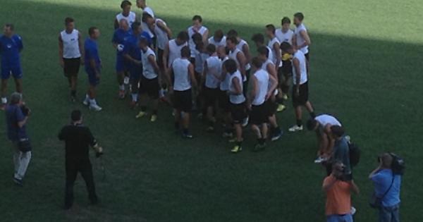 I giocatori allo stadio poco fa per la festa del ripescaggio