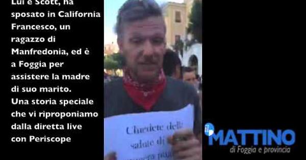 Lui è Scott, ricercatore universitario americano, ha sposato in California Francesco, un ragazzo di Manfredonia, ed ora è a foggia ad assistere la suocera. Una storia speciale, ripresa durante la diretta live del Puglia Pride a Foggia, che vi raccontiamo