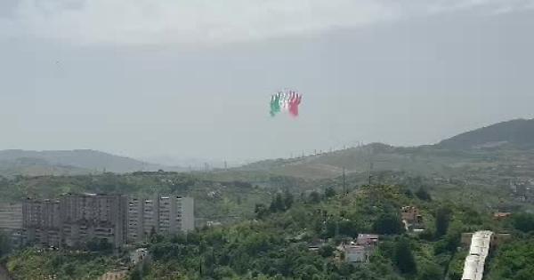 Le spettacolari acrobazie delle Frecce tricolori su Potenza. Oggi pomeriggio poco dopo le 15.30 tutti col naso all'insù mentre i velivoli della Pattuglia acrobatica dell'Aeronautica militare italiana, che festeggia i suoi cento anni dalla fondazione, sfrecciavano sulla città. Cittadini emozionati e pronti a filmare il passaggio nei cieli, con la caratteristica striscia a tre colori. In questo video, girato da Martina Lo Pomo, un momento particolarmente suggestivo.