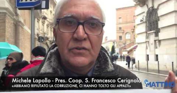 Aveva persino reso noto il nome della ditta che avrebbe vinto l'appalto sottratto alla sua cooperativa. Michele Lapollo, presidente della "S. Francesco" di Cerignola, questa mattina era con alcuni lavoratori, a manifestare sotto la Prefettura di Foggia per denunciare la corruzione che pervade la gestione degli appalti pubblici nella sua città. E nell'intervista che ci rilascia è ancora più esplicito