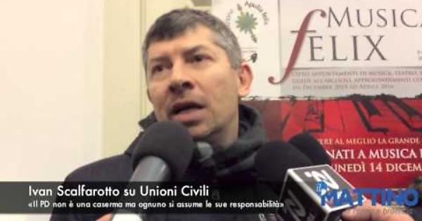 A Foggia per la presentazione del libro di Michela Marzano "Papà, mamma e gender", il sottosegretario alle riforme e ai rapporti con il Parlamento Ivan Scalfarotto interviene sul dibattito riguardante le unioni civili che sta spaccando anche il suo partito, il PD