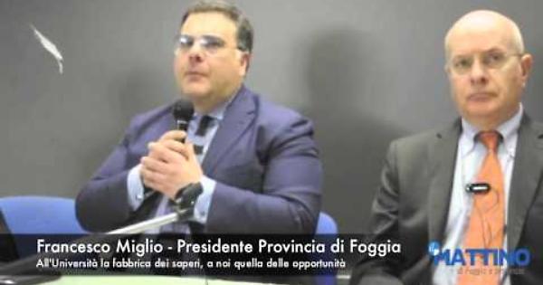 Il presidente della Provincia di Foggia, Francesco Miglio, intervenendo all'inaugurazione della sede del nuovo corso di laurea UniFg in Ingegneria dei sistemi logistici per l'agroalimentare, ha evidenziato l'importanza del gioco di squadra tra ateneo e istituzioni locali