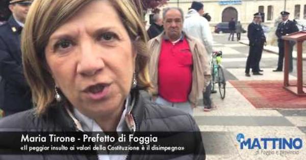 «Il peggior insulto che si possa fare alla Costituzione e ai valori che l'hanno fondata è il disimpegno dalla politica intesa come partecipazione». Lo sottolinea il Prefetto di Foggia, Maria Tirone, nell'intervista rilasciataci a margine della celebrazione della Festa della Liberazione, questa mattina a Foggia