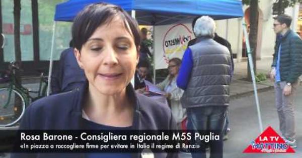 In tutte le piazze di Puglia, oggi e domani (14 e 15 maggio), i consiglieri regionali pugliesi del Movimento 5 Stelle raccolgono firme per impedire le riforme costituzionali escogitate da Matteo Renzi ed evitare «che la nostra democrazia venga trasformata in un regime», come dice la consigliera regionale, foggiana, Rosa Barone che abbiamo incontrato a Foggia, al gazebo di Corso Vittorio Emanuele.