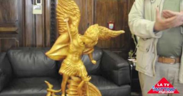 L'Arcangelo Michele d'ora in poi farà compagnia a Michele Emiliano in Regione: ha le sembianze di una statua dedicatagli da Alessandro Sernia, un artista di San Severo, donatagli questa mattina a Foggia, in Provincia, prima della riunione della giunta regionale.