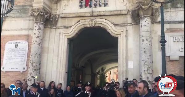 Silenzio e grande compostezza. Ecco come si presenta questa mattina la città di San Severo, pronta da dare l'ultimo saluto al maresciallo di Gennaro. Tricolore a mezz'asta listo a lutto sventola da palazzo celestini, sede del Comune - dove da pochi minuti si è aperta la camera ardente dedicata al marescialloucciso sabato scorso a Cagnano varano. Accanto al feretro avvolto nel Tricolore i familiari del maresciallo Di Gennaro: il padre Luigi, la sorella Lucia e la compagna Stefania. È presente anche il comandante interregionale dell'Arma dei Carabinieri Generale di corpo d'Armata Vittorio Tomasone e il comandate provinciale dei carabinieri il Colonello Marco Aquilio.vicino alla bara il gonfalone della città di San Severo. Si attende in giornata anche l'arrivo del Premier Giuseppe Conte che parteciperà alle esequie in cattedrale insieme al Presidente della Camera Roberto Fico, la ministra della Difesa Elisabetta Trenta, la ministra per il Sud Barbara Lezzi.
