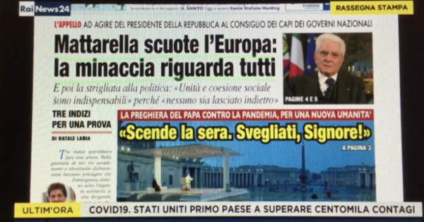 Prima l'impressionante supplica di Papa Francesco in una Piazza San Pietro deserta, poi il messaggio del Presidente Mattarella ai capi di Stato europei. Entrambi hanno invocato concordia umana e sociale del mondo nel fronteggiare la grave crisi che stiamo attraversando.