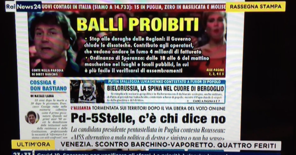 È una vetrina ricchissima di temi di primo piano, quella che presentano i giornali di oggi: dalla vicende discoteche ai fatti della Bielorussia, alle difficili intese sul territorio tra Pd e 5Stelle.