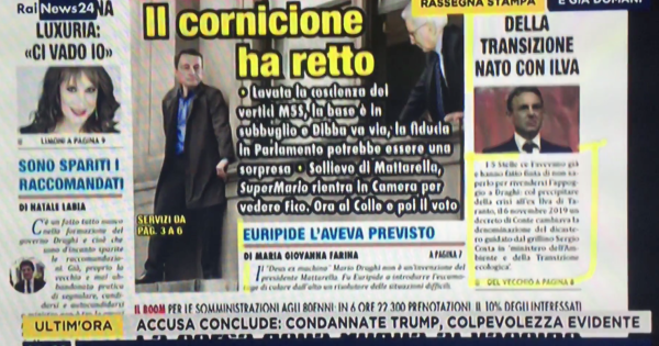 L'analisi della situazione politica nella rassegna stampa di RaiNews24, condotta su Rainews da Chiara Paduano, con il sociologo De Masi, Chicco Testa, il Direttore di Economy Sergio Luciano, il vicedirettore dell'Agi Paolo Borrometi. E con la nostra prima pagina.