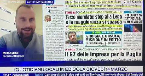 Sulla nostra prima pagina di oggi, 14 marzo 2024, nella rassegna stampa di RaiNews24 condotta da Francesca Biagiotti, col commento di Matteo massi (QN). Il giornale è qui