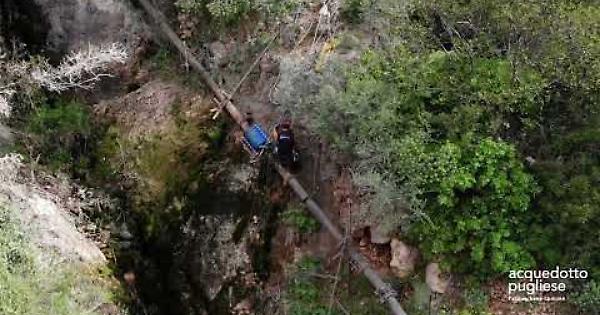 La tubazione in ghisa da 20 centimetri di diametro segue per 250 metri la parete rocciosa a nord della gravina, a cui è ancorata. I tre tecnici hanno dovuto lavorare sospesi a 80 metri dal ciglio, in perfetta rispondenza alle più sofisticate norme di sicurezza sul lavoro, applicando alla condotta un manicotto realizzato ad hoc.